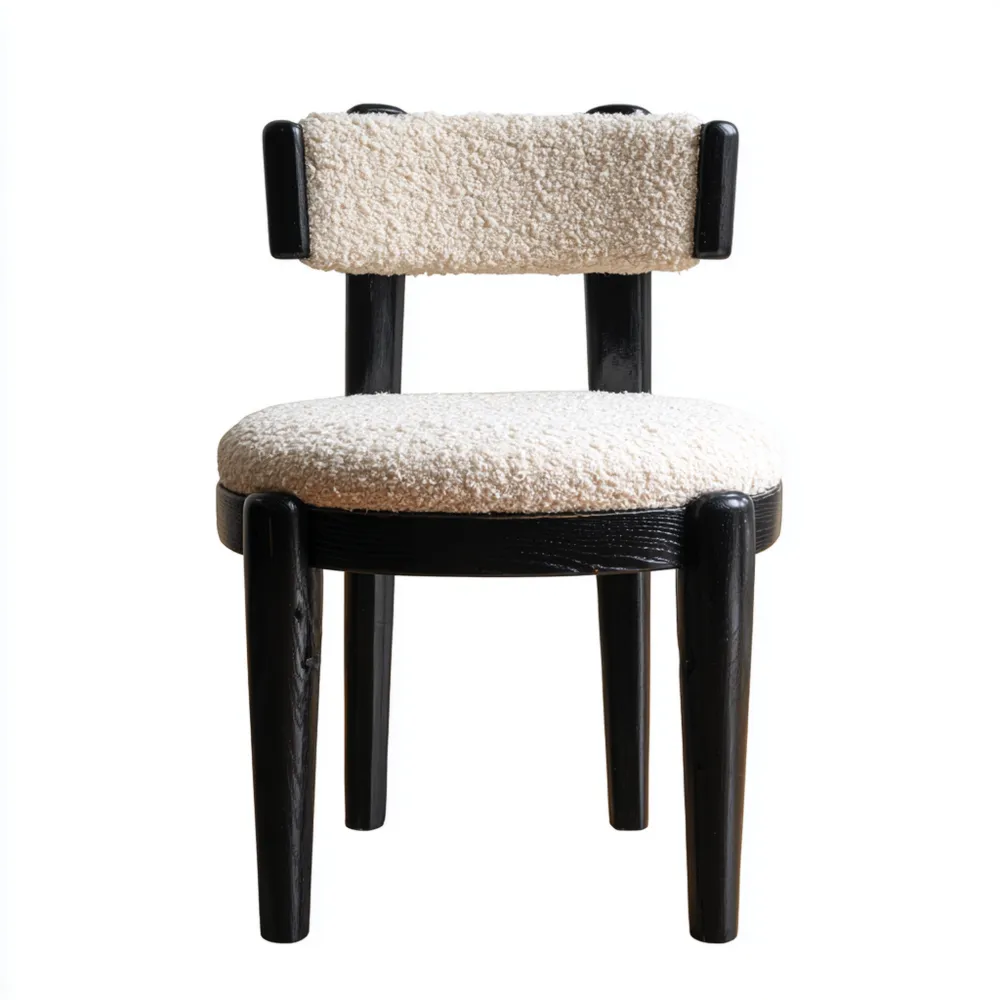 Material und VerarbeitungDer Stuhl besteht aus robustem Holz mit einer weichen Polsterung aus Schaffellimitat in Cremefarbe, die auf einem stabilen schwarzen Gestell angebracht ist.