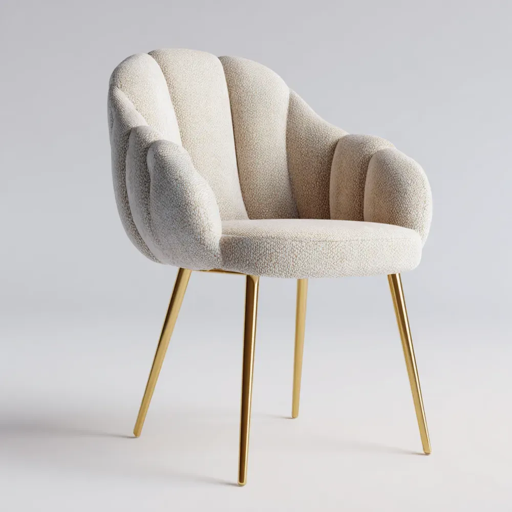 Material und VerarbeitungDer Stuhl ist mit einem cremefarbenen Bouclé-Stoff bezogen, der für seine weiche Haptik und Langlebigkeit bekannt ist. Die robusten Metallbeine sind in einem eleganten Goldton gehalten.
