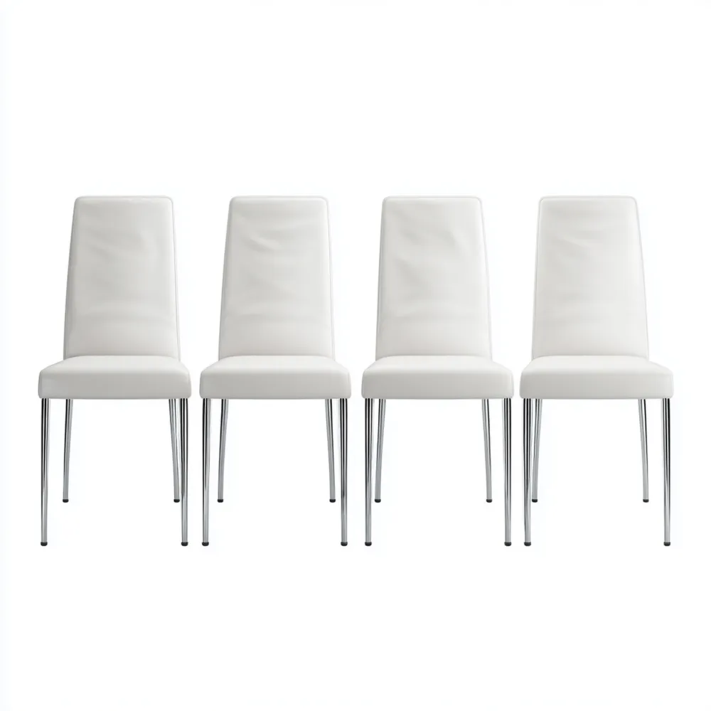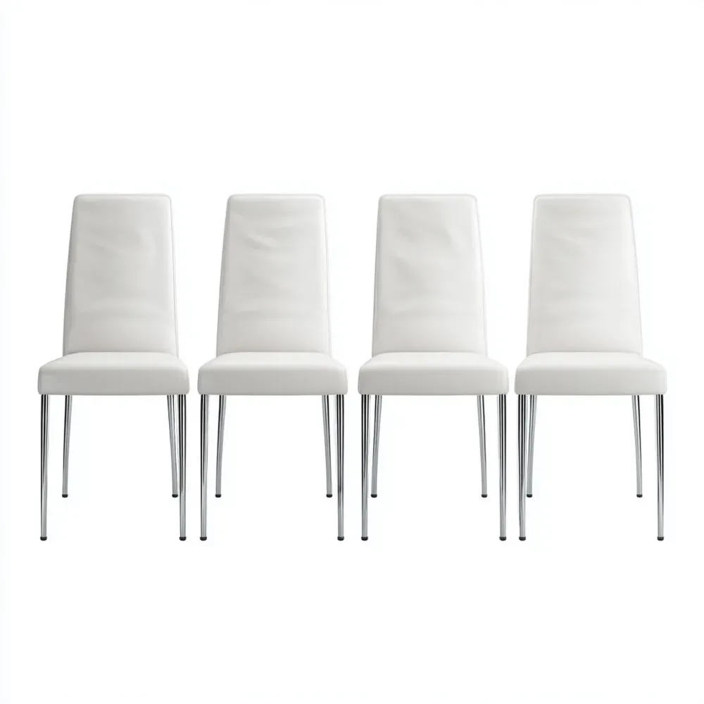 Material und VerarbeitungDie Stühle sind mit weißem Kunstleder bezogen, das sich durch seine Robustheit und Pflegeleichtigkeit auszeichnet. Die Metallbeine sorgen für Stabilität und Langlebigkeit.