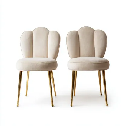 Material und VerarbeitungDie Stühle sind mit weichem, beigem Samt gepolstert und stehen auf stabilen, goldenen Metallbeinen. Die hochwertige Verarbeitung garantiert Langlebigkeit.
