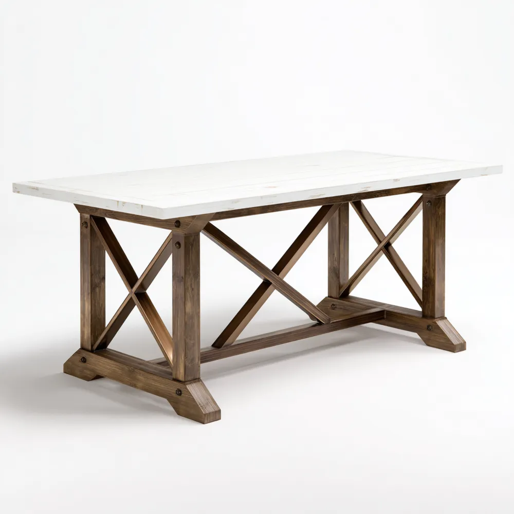 Der Tisch besteht aus massivem Holz mit einer natürlichen Holzmaserung. Die Tischplatte ist weiß und ergänzt das rustikale Gestell aus naturbelassenem Holz.